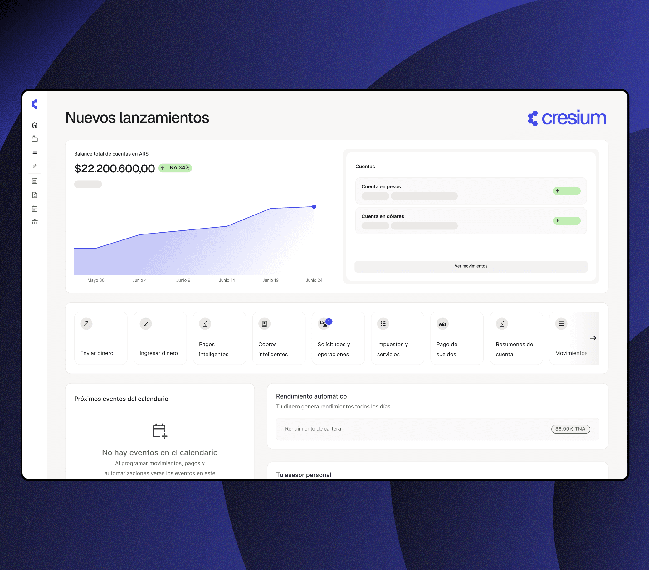 Cresium es una plataforma financiera todo-en-uno diseñada para PYMES en Argentina. Facilita la gestión de transacciones, inversiones y préstamos en un solo lugar.